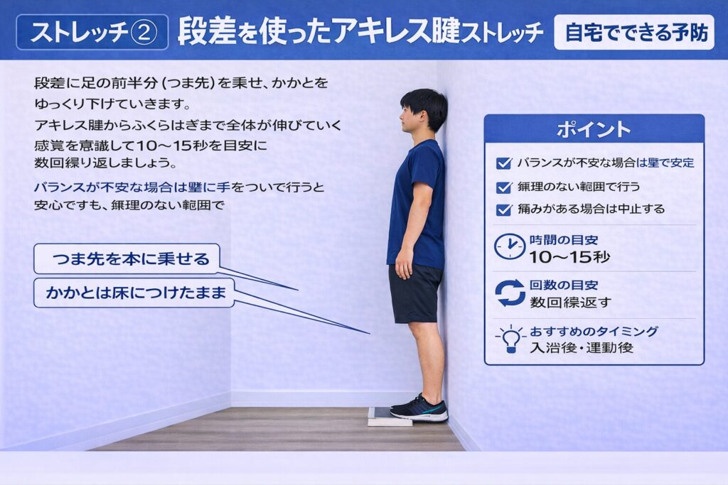 ストレッチ②:段差を使ったアキレス腱ストレッチ(自宅でできる予防)