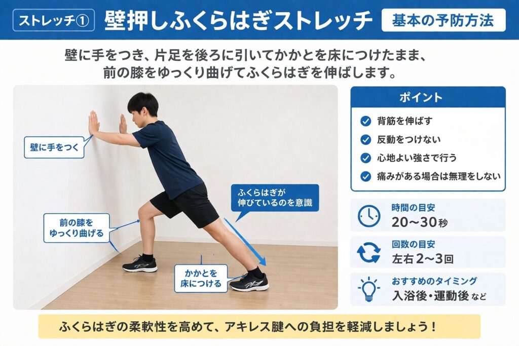 ストレッチ①:壁押しふくらはぎストレッチ(基本の予防方法)