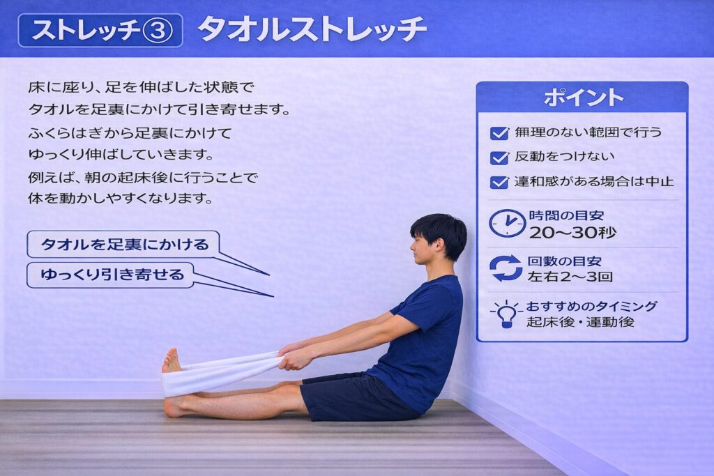 ストレッチ③:タオルストレッチ(負担を抑えたケア方法)